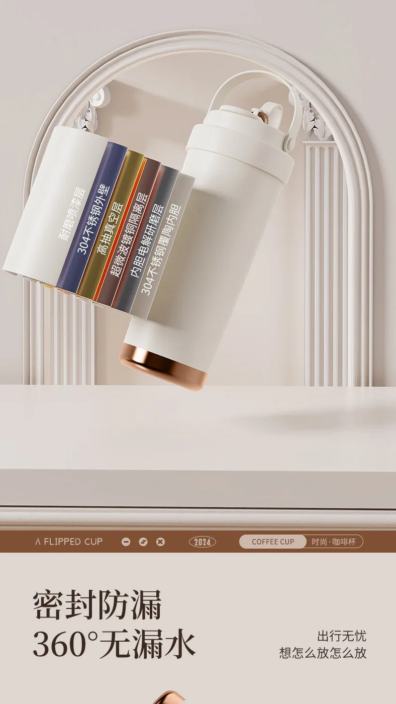 Large capacity ceramic inner pot insulated cup, women's office dual drink coffee cup, portable straw, car water cup