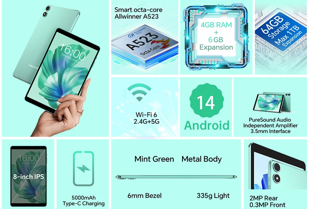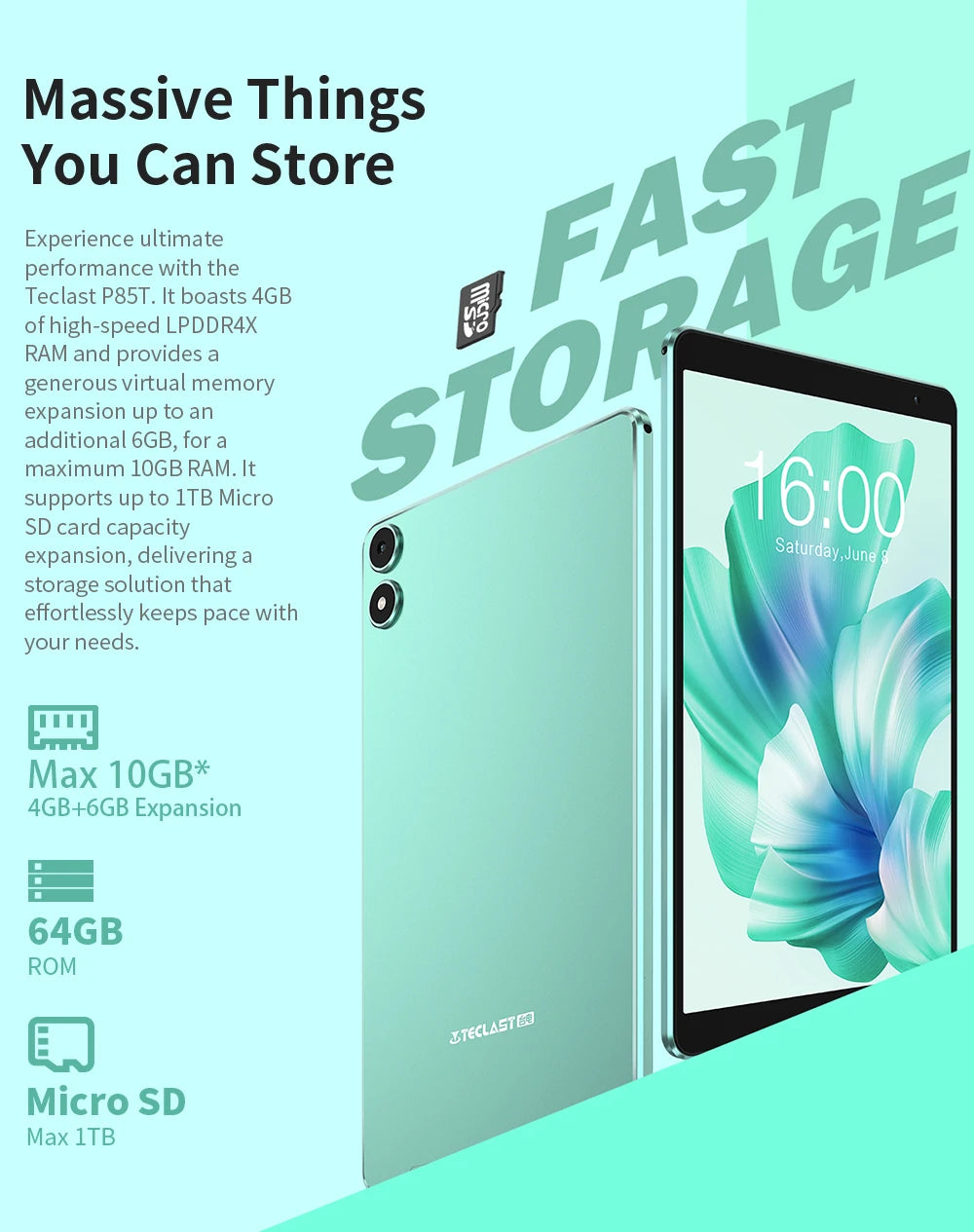 Teclast P85T 2024 Tablet (Allwinner A523 1.8GHz 8-Core/10GB (4GB+6GB)RAM/64GB ROM/8 Inch 1200*800iPS/WiFi 5/BT 5.0/5000mAh