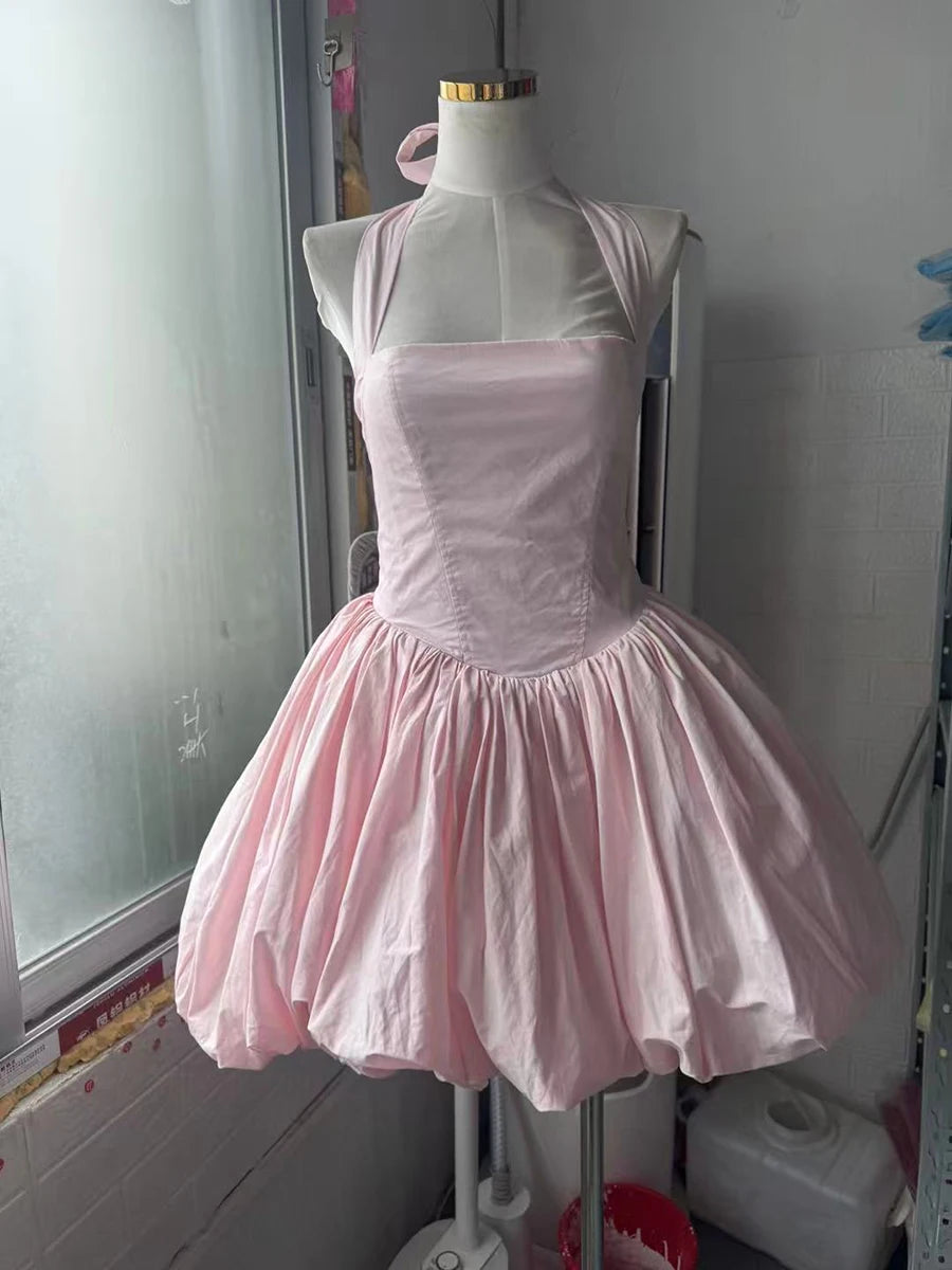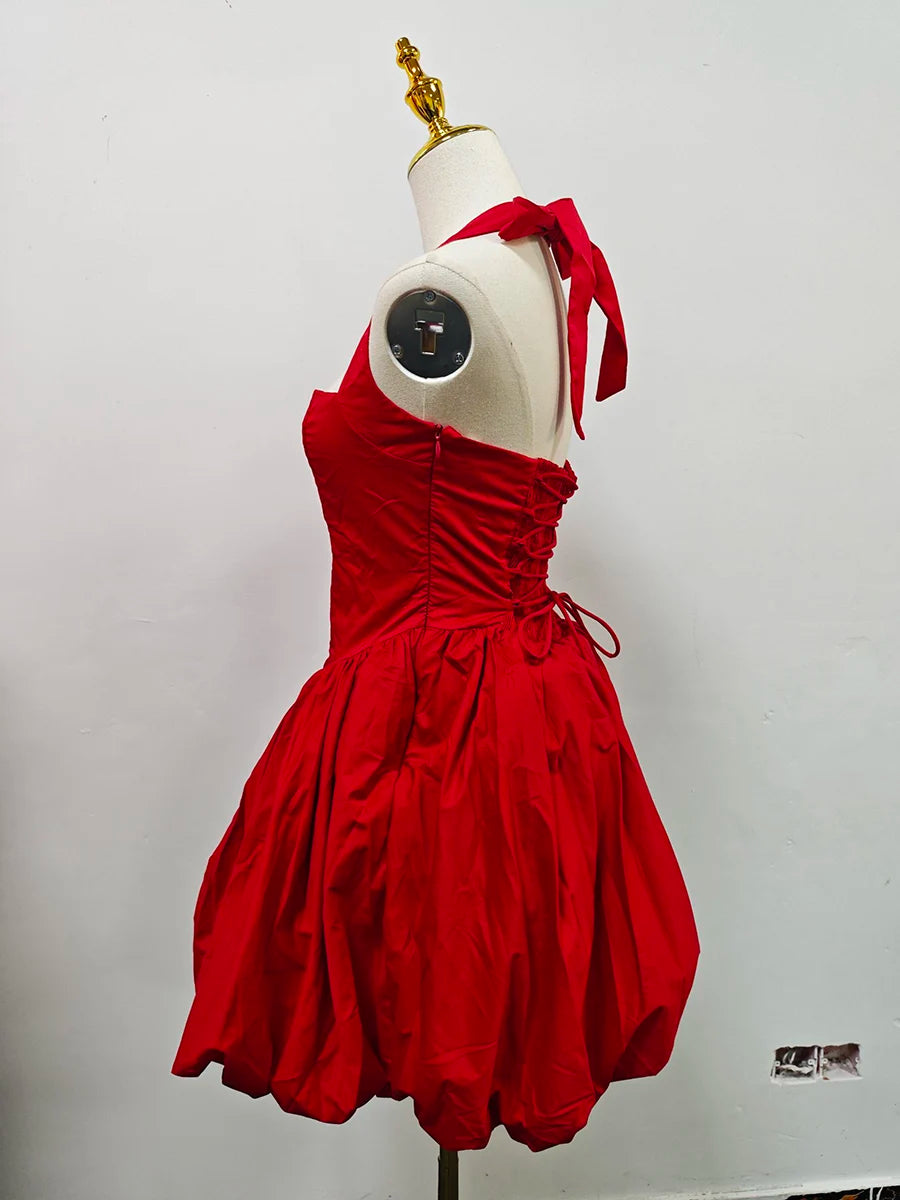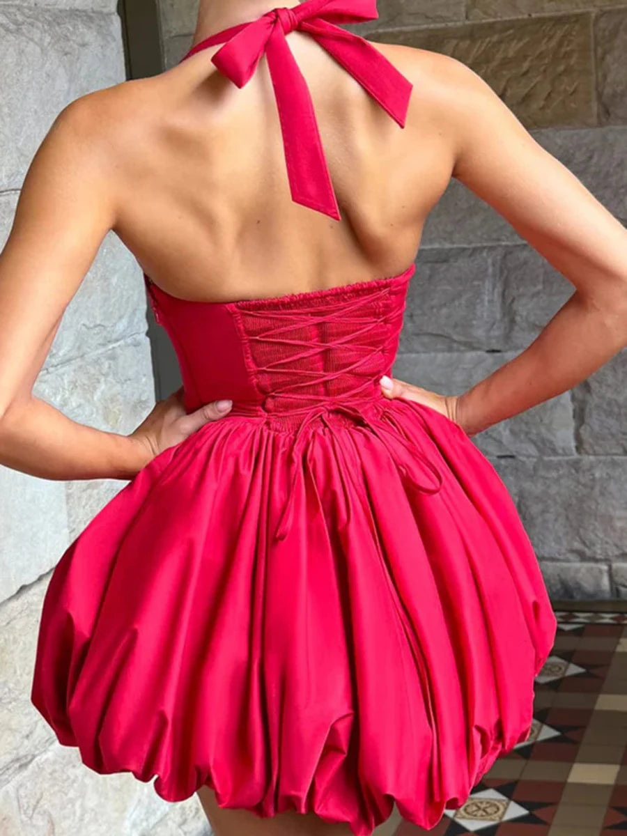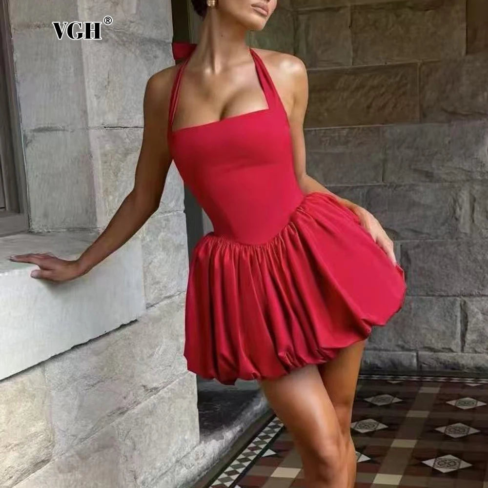 VGH Sexy Temperament Tunic Ball Gown for Women Halter Sleeveless Patchwork Lace Up Short Prom Dresses Female Clothing Fashion
